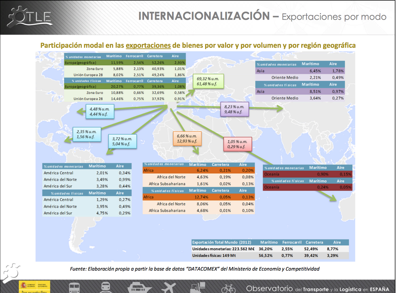 - El transporte marítimo es estratégico por su ventaja en los mercados emergentes donde España debe orientar una parte importante de su esfuerzo de internacionalización. Además en los últimos años ha tendido a ganar cuota tanto en términos de volumen (unidades físicas) como de valor (unidades monetarias).