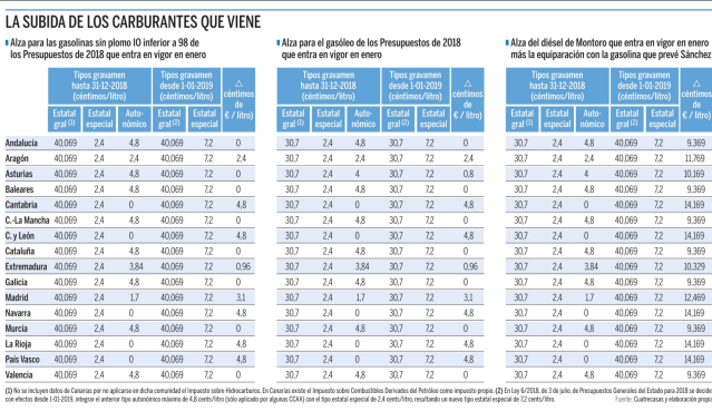A la subida del gasóleo que va a entrar en vigor en enero, se le suma la anunciada por el Gobierno de Sánchez. Equiparar el gasóleo a la gasolina desde enero supondrá un alza del impuesto al gasóleo de cerca del 37,9 céntimos por litro a 47,269 que sube la gasolina. Esto arroja un alza de 14,169 céntimos/litro en Cantabria, Navarra, País Vasco, Castilla y León y La Rioja. El incremento será de 12,469 en Madrid; de 11,769 en Aragón; de 10,329 en Extremadura; de 10,169 en Asturias, y de 9,369 en Andalucía, Baleares, Castilla-La Mancha, Cataluña, Galicia, Murcia y Comunidad Valenciana.