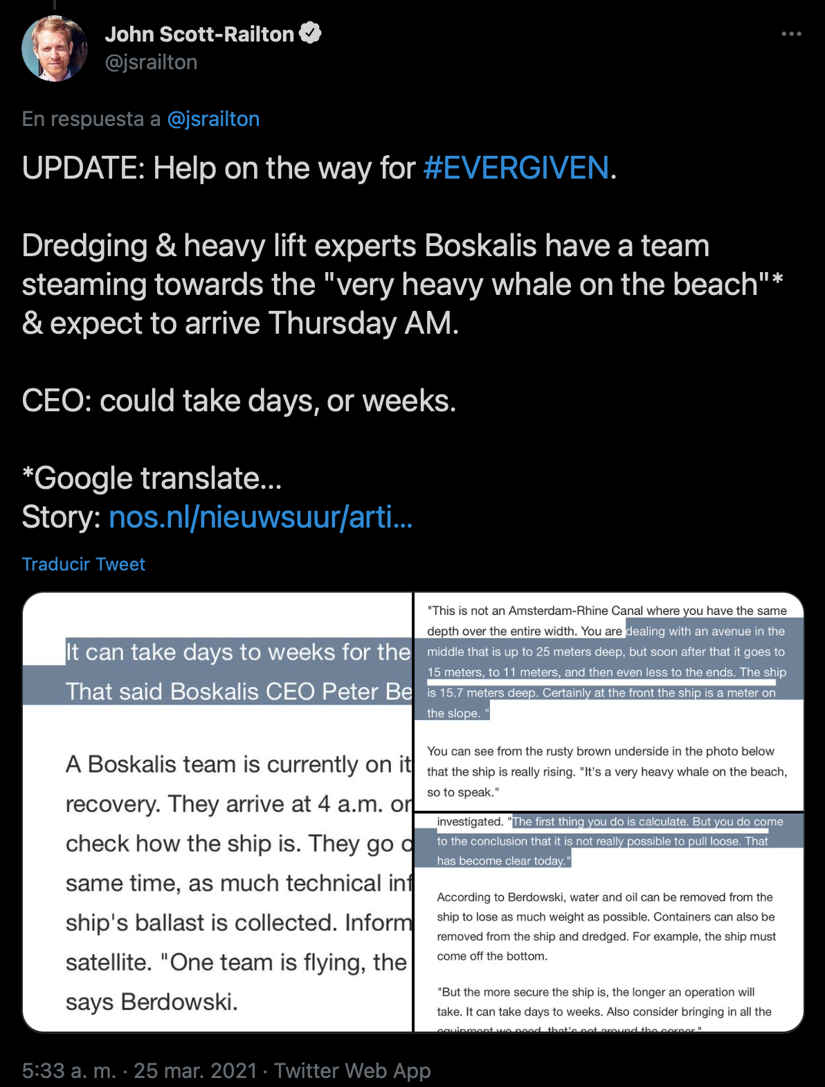 «Paradójicamente, el barco, uno de los cargueros más grandes y modernos del mundo, ha encallado justo en el principal conducto por el que pasan más de 50 buques cada día. Solo en 2020 el canal alcanzó los 19.000 barcos que pasaron por sus diques, una cifra que a su vez deja golosos ingresos, concretamente más de 4.500 millones de euros al año a las autoridades egipcias encargadas de su operativa. Aproximadamente el 12% del comercio mundial pasa por el Canal de Suez, punto de conexión entre el Mediterráneo y el Mar Rojo y, lo que es más importante, supone la vía directa para la llegada de mercancías procedentes de Oriente Próximo y gran parte de Asiahacia Europa. La principal cuestión ahora es saber exactamente cuándo se reanudará con normalidad el tráfico de mercancías y, sobre todo, de productos petrolíferos que llegan cada día a los puertos europeos y del que depende en gran parte la economía de todo el continente. En el corto plazo, el problema está en los más de 30 buques que se encuentran varados a la espera de que quede libre el canal. De ellos, más de una decena son ‘gaseros’ y petroleros que miran el reloj contando las horas para poder descargar más de 13 millones de barriles en Atenas, Marsella, Valencia o Róterdam. Un retraso prolongado podría crear serios problemas para los fletes y propietarios de otros buques que aun no han llegado a la zona y que tendrían que utilizar la única vía alternativa posible a través de Ciudad del Cabo, obligando a bordear toda la costa africana, algo que llevaría a incrementar considerablemente el coste de cada barril de petróleo con origen en Arabia Saudí, Irak o Kuwait».