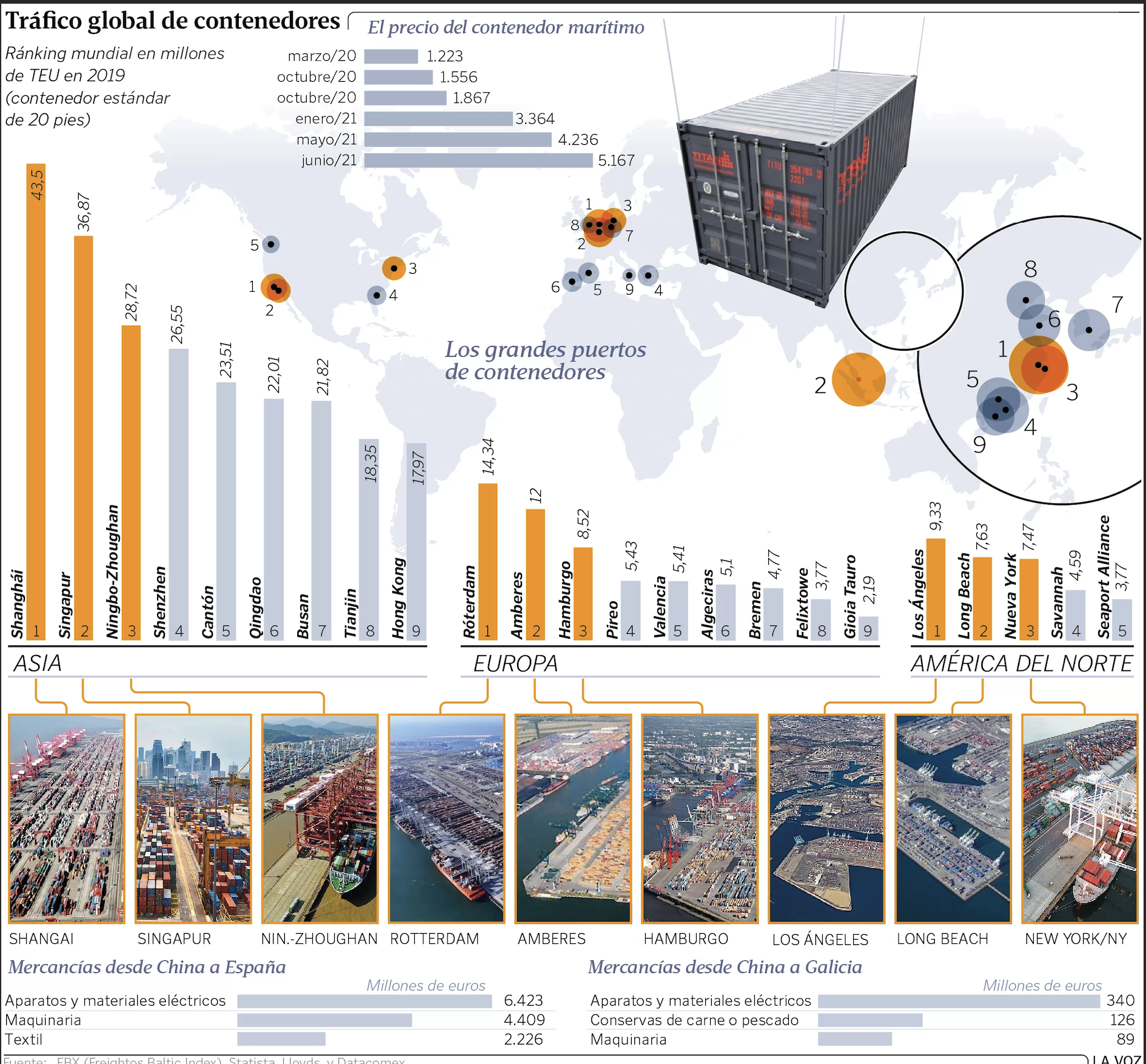 Barcelona, 3 de agosto del 2021.- Las consecuencias de la paralización de la economía mundial en 2020 por la pandemia Covid19 permanecen…un año después. Las cadenas de suministro, con escasez en materias primas como los chips, escasez de contenedores y el comercio internacional se resienten en diferentes variables. Por ejemplo, la publicación SHIPS ha publicado el siguiente diagnóstico que monitoriza la subida de los precios del transporte marítimo: