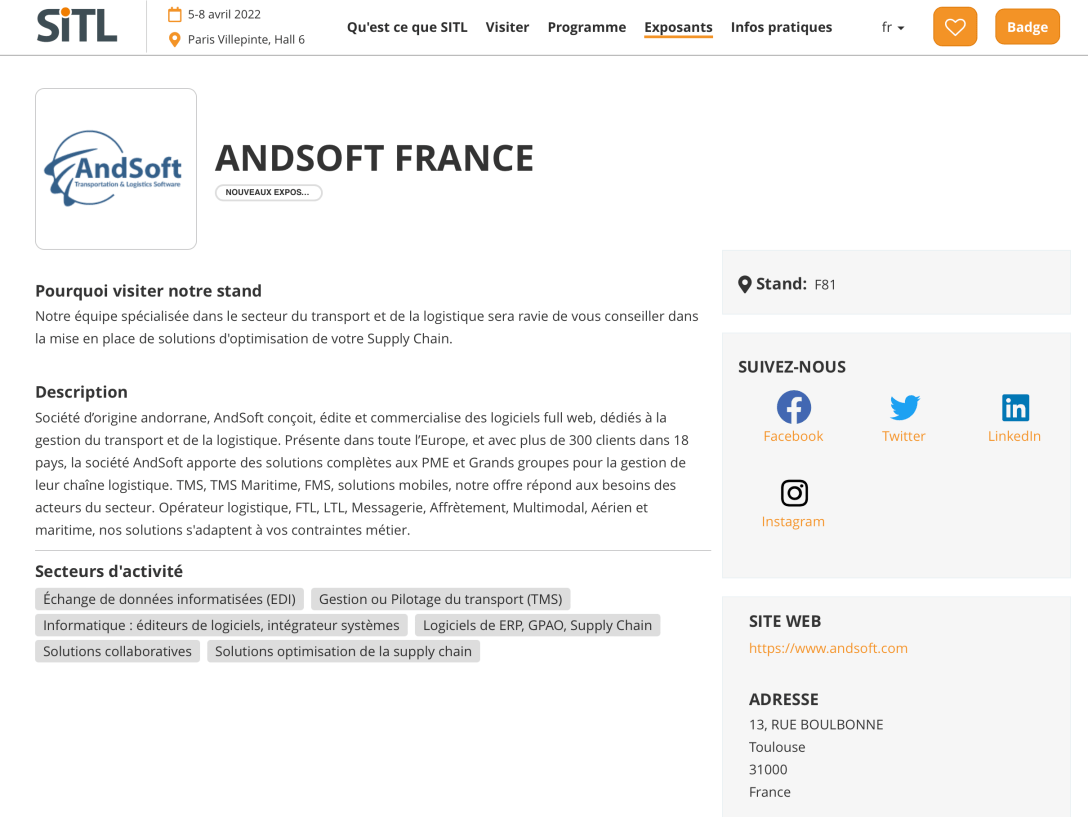 Barcelona, 15 de marzo del 2022.- AndSoft aprovechará su stand F81 en la SITL de París (5 a 8 de abril) para explicar a los empresarios de transporte, logística y profesionales tecnológicos, los últimos desarrollos en su plataforma eTMS. La digitalización del transporte de mercancías se ha acelerado en los dos últimos años y AndSoft ha creado nuevas soluciones para dar respuesta a las necesidades de sus clientes en más de 17 países.