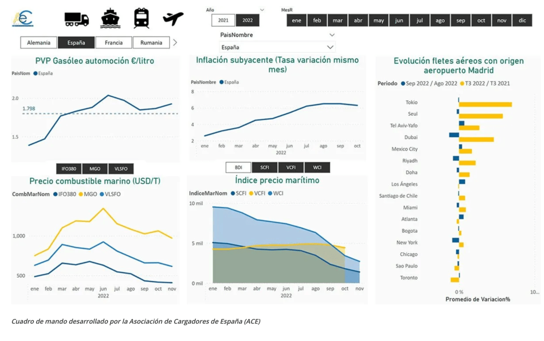 Barcelona, 27 de enero del 2023.- La patronal de Cargadores, ACE, ha desarrollado un Cuadro de Mando con acceso interactivo a los datos estadísticos del transporte por carretera, marítimo, ferroviario y aéreo. Estas son sus características: