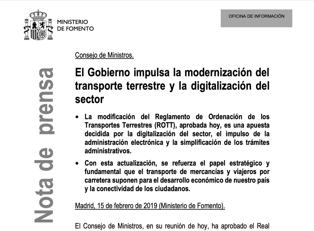 Barcelona, 19 de febrero del 2019.- El Consejo de Ministros aprobó el pasado 15 de febrero el Real Decreto que modifica el Reglamento de Ordenación de los Transportes Terrestres (ROTT) y otras normas relacionadas. De esta manera, se ha realizado una revisión profunda de la normativa reguladora del transporte terrestre, materializando una apuesta decidida por la simplificación de trámites administrativos, la digitalización del sector y la administración electrónica.